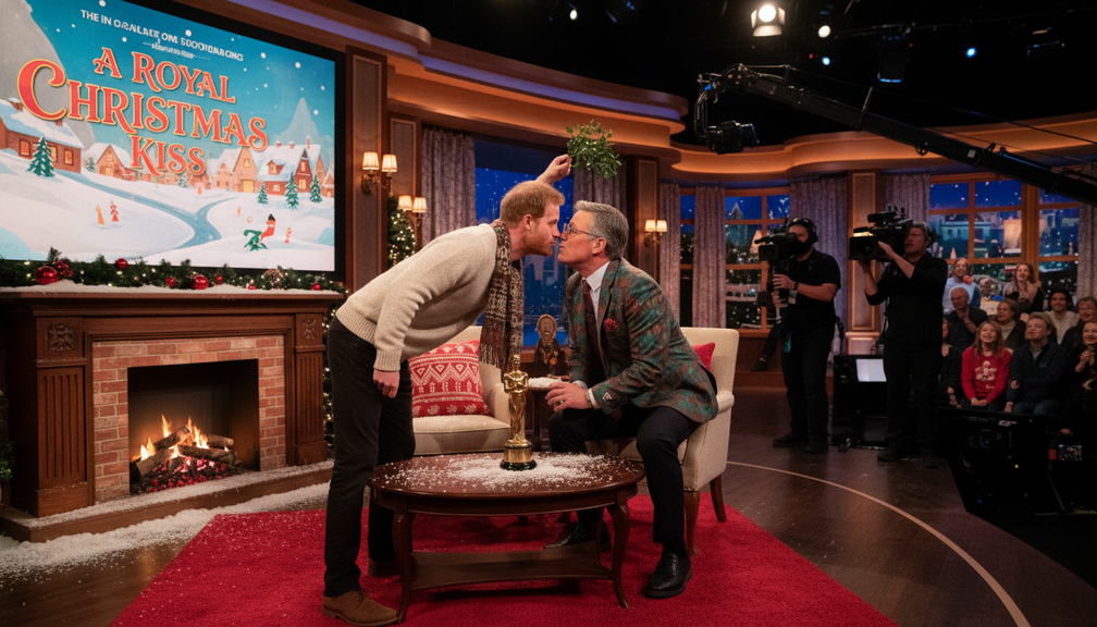 الأمير هاري يتظاهر بأداء اختبار تمثيل لفيلم عيد الميلاد على Hallmark في برنامج The Late Show، ويكاد يقبل ستيفن كولبرت