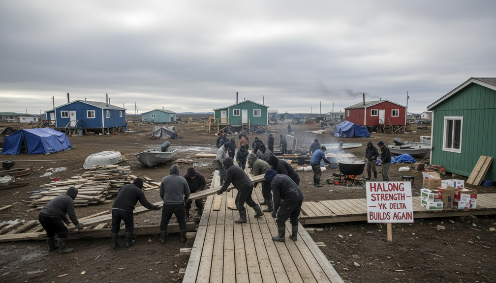 في أعقاب تأثير إعصار هالونغ على دلتا يوكون-كوسكوكويم في غرب الألاسكا، تبرز قوة المجتمعات المحلية في غرب الألاسكا بكاملها. على الرغم من التحديات التي واجهها أكثر من ألف شخص نزحوا، يسود روح الاعتماد على الذات والدعم المتبادل في غياب التدخل الحكومي.