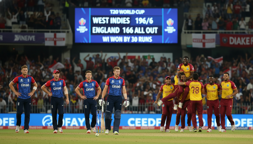 تعرضت آمال إنجلترا في كأس العالم T20 لضربة قوية بعد هزيمة مدمرة على يد غرب الهند في المجموعة C. شهدت المباراة هيمنة غرب الهند حيث قاد الأداء المتفجر لشيرفان رذرفورد فريقه للفوز بفارق 30 نقطة على إنجلترا. مع هذه الخسارة، تجد إنجلترا نفسها الآن في وضع حرج، حيث تحتاج إلى الفوز في مبارياتها القادمة ضد اسكتلندا وإيطاليا لديها أي فرصة للتقدم إلى الدور النهائي.