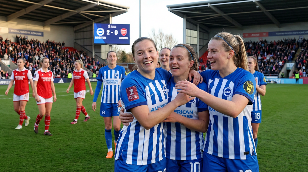 نجح برايتون في تحقيق فوز مفاجئ عندما تغلب على آرسنال في ربع نهائي كأس الاتحاد الإنجليزي للسيدات، مما يمثل خروج آرسنال للمرة الثانية على التوالي في هذه المرحلة. يضع الفوز برايتون على بُعد انتصارين فقط من الفوز بلقبهم الكبير الأول، بينما يستمر انتظار آرسنال لرفع كأس الاتحاد الإنجليزي للسيدات لعقد من الزمان. لاعبة تشيلسي السابقة فران كيربي لعبت دورًا رئيسيًا بتقديمها تمريرتين حاسمتين في الفوز المذهل 2-0 لبرايتون.