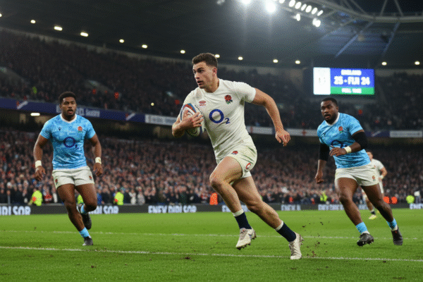 في مباراة مثيرة ضد فيجي، أبرز هنري آرنديل موهبته الخام بتسجيل هدف مذهل في الدقيقة السبعين من المباراة، في ظهوره الأول مع إنجلترا منذ كأس العالم 2023. سرعته البرقية وأداؤه الذي يغير مجرى اللعب أثارا إعجاب الجماهير والنقاد على حد سواء بإمكانية تأثيره المحتمل على الفريق ومستقبل الرغبي الإنجليزي.
