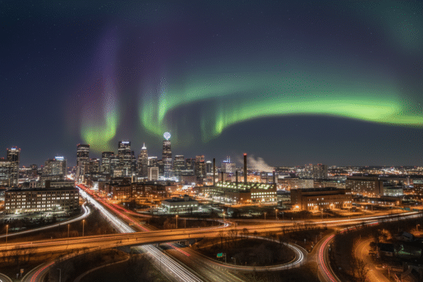 عاصفة مغناطيسية قوية تضيء سماء الولايات المتحدة، مما يقدم للمواطنين في أكثر من عشرين ولاية نظرة نادرة على أضواء الشمال. يعرض هذا المنظر الطبيعي جمال روح ريادة الأعمال والمبادرة الفردية، ينتشر من نيويورك إلى تكساس، مجسداً الروح الريادية التي تغذي نجاح بلادنا.