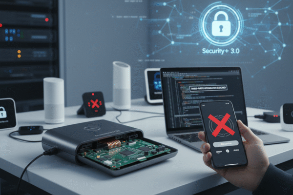 قدمت مجموعة شامبرلين منصة Security+ 3.0، مما يمنع صانعي الملحقات من الجهات الثالثة من التكامل مع فتاحات أبواب المرآب المتصلة بهم. هذه الخطوة تقيد قدرة مستخدمي المنازل الذكية على التحكم في أبواب مرآبهم من خلال أنظمة المنازل الذكية الشهيرة، مما يؤدي إلى الإحباط والإزعاج.